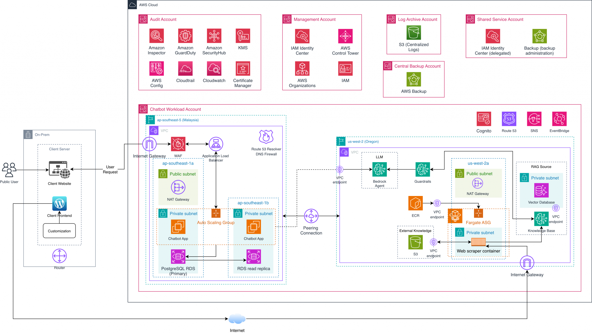 Our Secure RAG GenAI Chatbot architecture establishes a well-architected, multi-account AWS environment where governance, audit, logging, and backups are separated by design — while the chatbot workload runs in dedicated workload accounts with secure connectivity to GenAI services and RAG knowledge components. This ensures centralized control and visibility, strong security guardrails, and the flexibility to evolve the chatbot as your knowledge base and user demand grow.